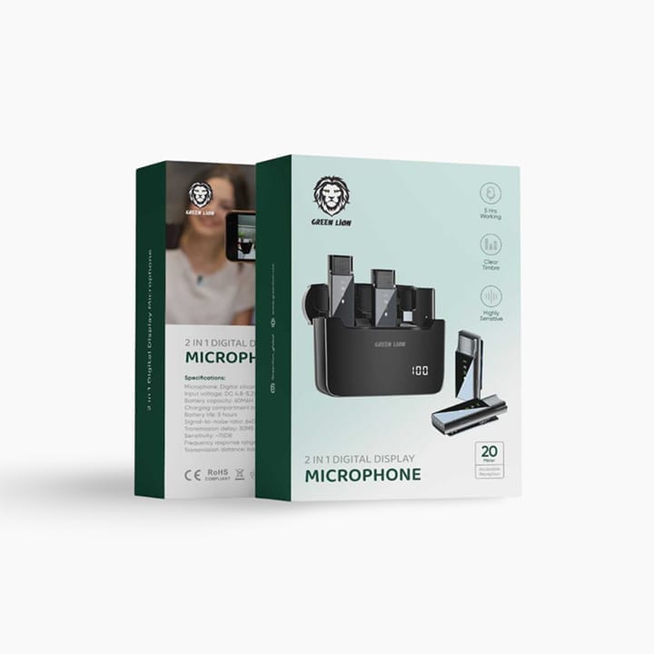 The Green Lion 2 in 1 Digital Display Microphone presents an effective and cost-efficient solution for professional sound recording. It comprises two intricately designed digital display microphones housed within a rechargeable Type-C connector case. With a substantial 600mAh battery capacity, it ensures prolonged usage, up to 5 hours on a single charge. This innovative digital microphone, boasting a 64DB SNR (Sound-to-Noise Ratio), -75DB Sensitivity, 30ms Transmission delay, and excellent timbre capability, provides a crystal-clear sound recording experience. Combined with a 20-meter range, these features make it an ideal choice for scenarios where audio quality, fidelity, and precise sound reproduction are paramount.