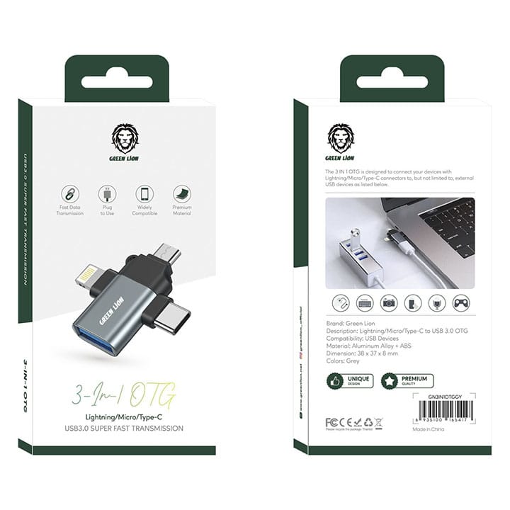 The Green Lion 3 in 1 OTG facilitates the connection of devices featuring Lightning, Micro, and Type-C connectors to a range of external USB devices and more. This OTG enables swift data transfer in a rapid data transmission mode, ensuring quick sharing of your data. Enjoy the benefits of fast data transmission and convenient plug-and-play functionality.