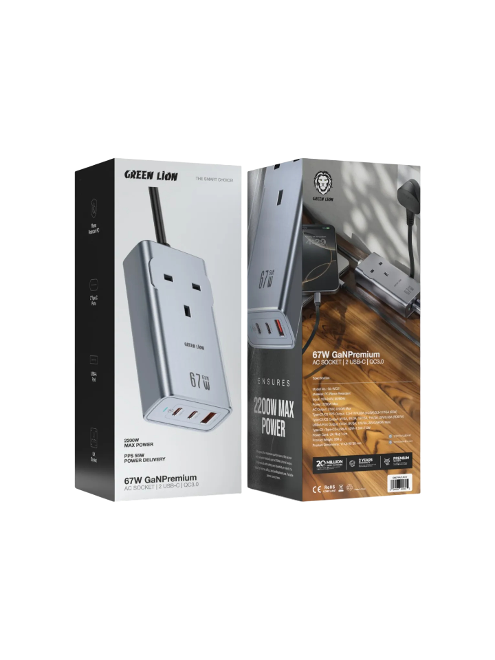 - Type-C1/C2 Output: 5V/3A, 9V/3A, 12V/3A, 15V/3A, 20V/3.35A (PD67W)
