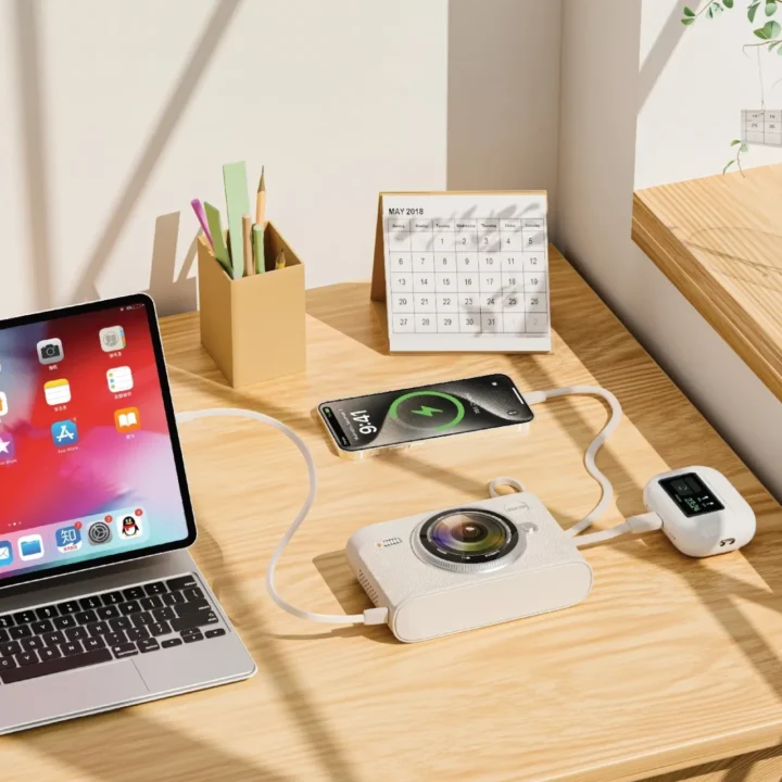 Green Lion All-in-One 10000mAh Power Bank with PD 20W fast charging, built-in cables, IPS touchscreen, Bluetooth 5.3, speaker, mic & app support.