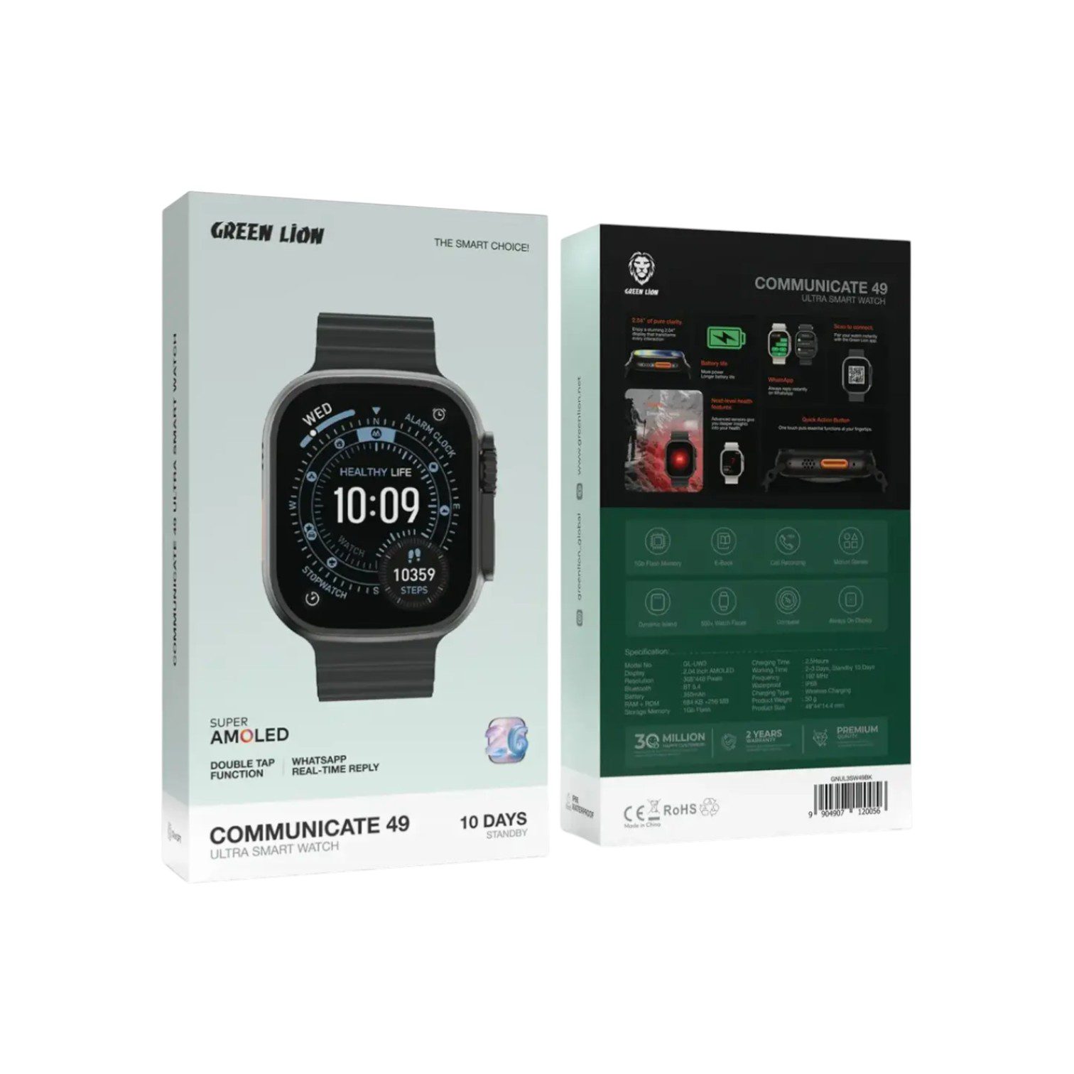 The Green Lion Communicate 49 Ultra Smart Watch is a feature-packed wearable designed for those who demand high performance and seamless communication. First, it boasts a massive 2.04-inch Super AMOLED display with a 368×448 resolution, delivering incredibly vivid visuals and crisp text. Notably, it is one of the few smartwatches in its class to offer WhatsApp real-time reply and a built-in ChatGPT assistant, making it a true powerhouse for productivity. Finally, the premium 49mm chassis is built to last, featuring 3 ATM water resistance to handle splashes and outdoor adventures with ease.