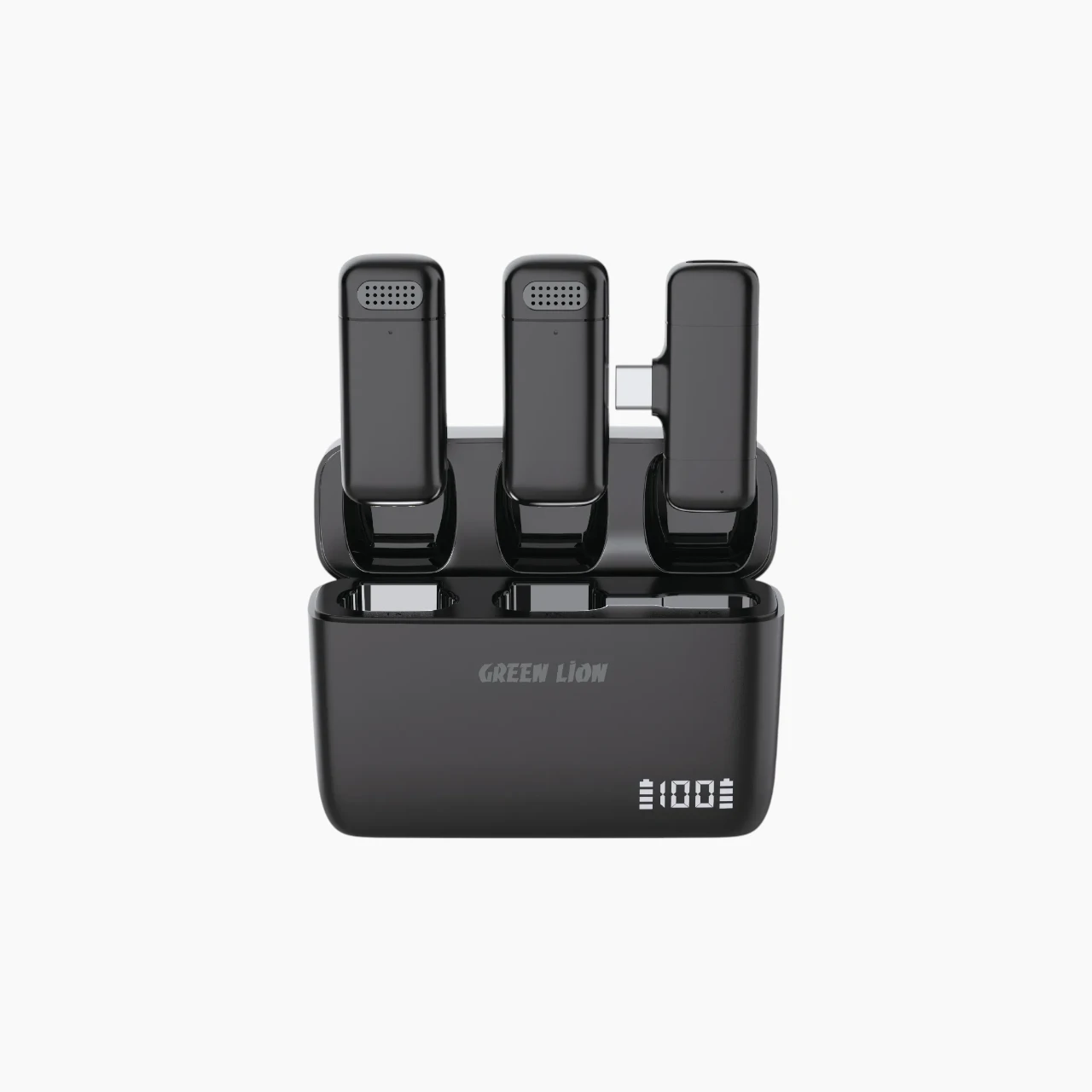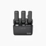 Wireless microphone with long-distance transmission, automatic pairing, and 7H working time. Includes a charging case with 3 extra charges, plus plug & play setup for seamless recording anywhere.