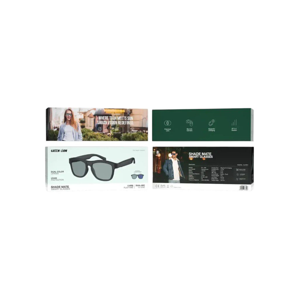 The Green Lion Shade Mate smart glasses offer a unique blend of high-end style and modern technology. First, these glasses feature dual-color polarized lenses that transition from gray to blue, adapting to your look while providing UV400 protection. Notably, they are equipped with a dual-mic ENC (Environmental Noise Cancellation) system, which ensures your hands-free calls remain crystal clear even in noisy city environments. Finally, with Bluetooth 5.4 connectivity and a comfortable PC + ABS frame, they provide a seamless audio experience for up to 5 hours of playback.