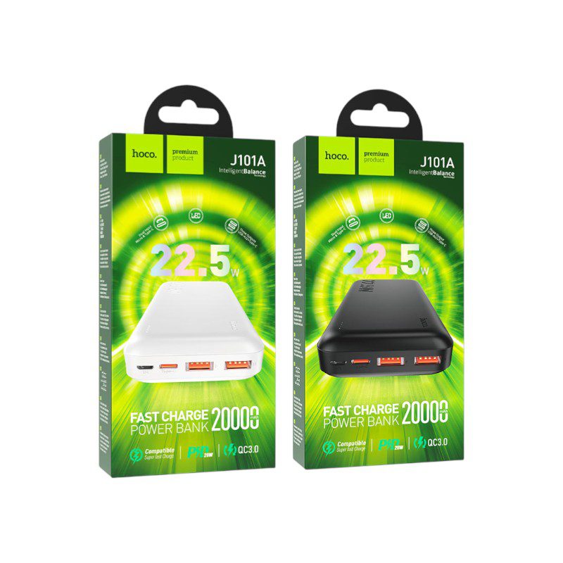 The Hoco J101A 22.5W Power Bank is a high-capacity, versatile charging solution designed for users who need reliable power on the move. First, with a 20,000mAh capacity, it can fully charge a standard smartphone 3 to 4 times. Notably, it supports a wide range of fast charging protocols, including PD3.0, QC3.0, and SCP, ensuring compatibility with almost any modern device. Finally, the LED power indicator features a special green light to let you know when high-speed charging is active, giving you peace of mind while your devices power up.