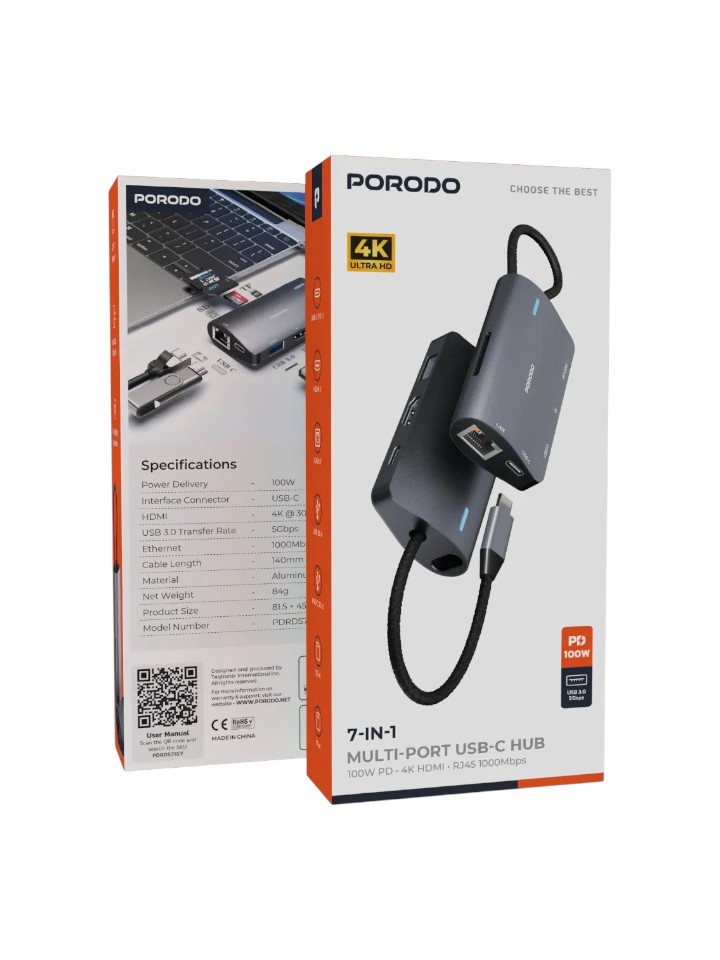 In an era where laptops are becoming thinner and ports are becoming scarcer, the Porodo 7-IN-1 Multi Port USB-C Hub in Gray stands out as an absolute necessity. Designed for tech-savvy professionals, gamers, and students, this hub transforms a single USB-C port into a powerful workstation. Whether you are managing large data transfers or setting up a high-definition home office, the Porodo hub delivers the speed and efficiency you demand.