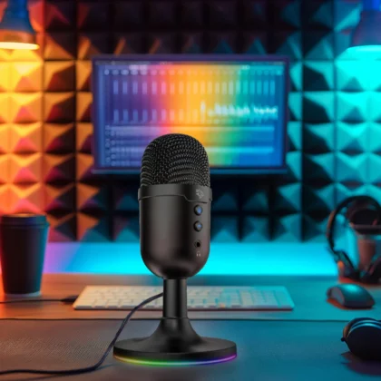 Whether you’re a gamer or a musician, the Porodo Condenser Microphone is a valuable addition to your gear, enabling you to capture crystal-clear audio. Renowned for its studio-quality sound, thanks to the 16mm capsule diameter, this microphone empowers you to record your voice in the comfort of your own space without the need for additional equipment. It also includes an adjustable extension stand to suit your preferences, and its RGB lights can create a studio-like atmosphere and illuminate your room. Moreover, with a generous 2-meter cable extension, you have the freedom to move around as needed while using the microphone.