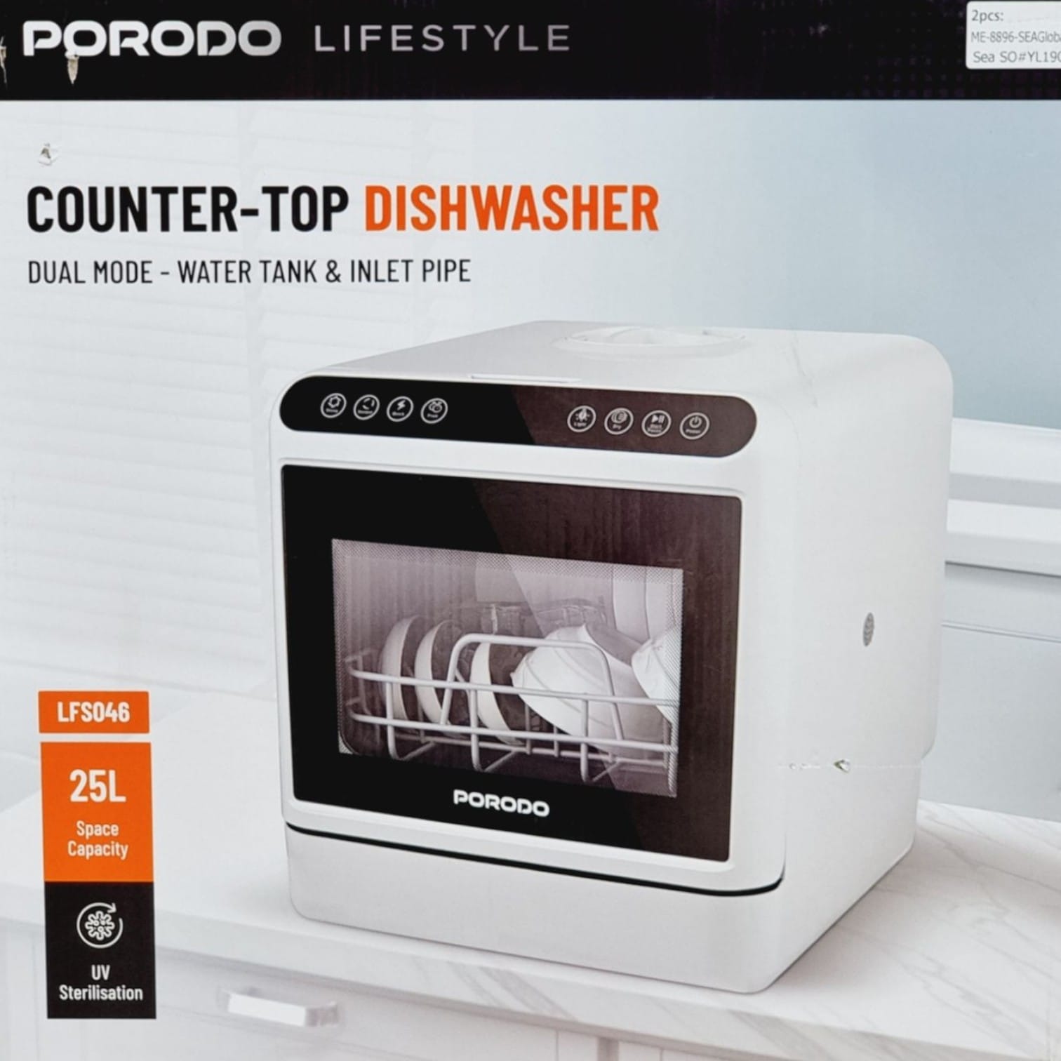 The Porodo Lifestyle Counter-Top Dishwasher delivers powerful 1000W cleaning with a 25L capacity and built-in 5L water tank—no plumbing needed. Ideal for small kitchens or offices, it features UV sterilization, ultra-quiet 52dB operation, and a sleek design that fits anywhere.