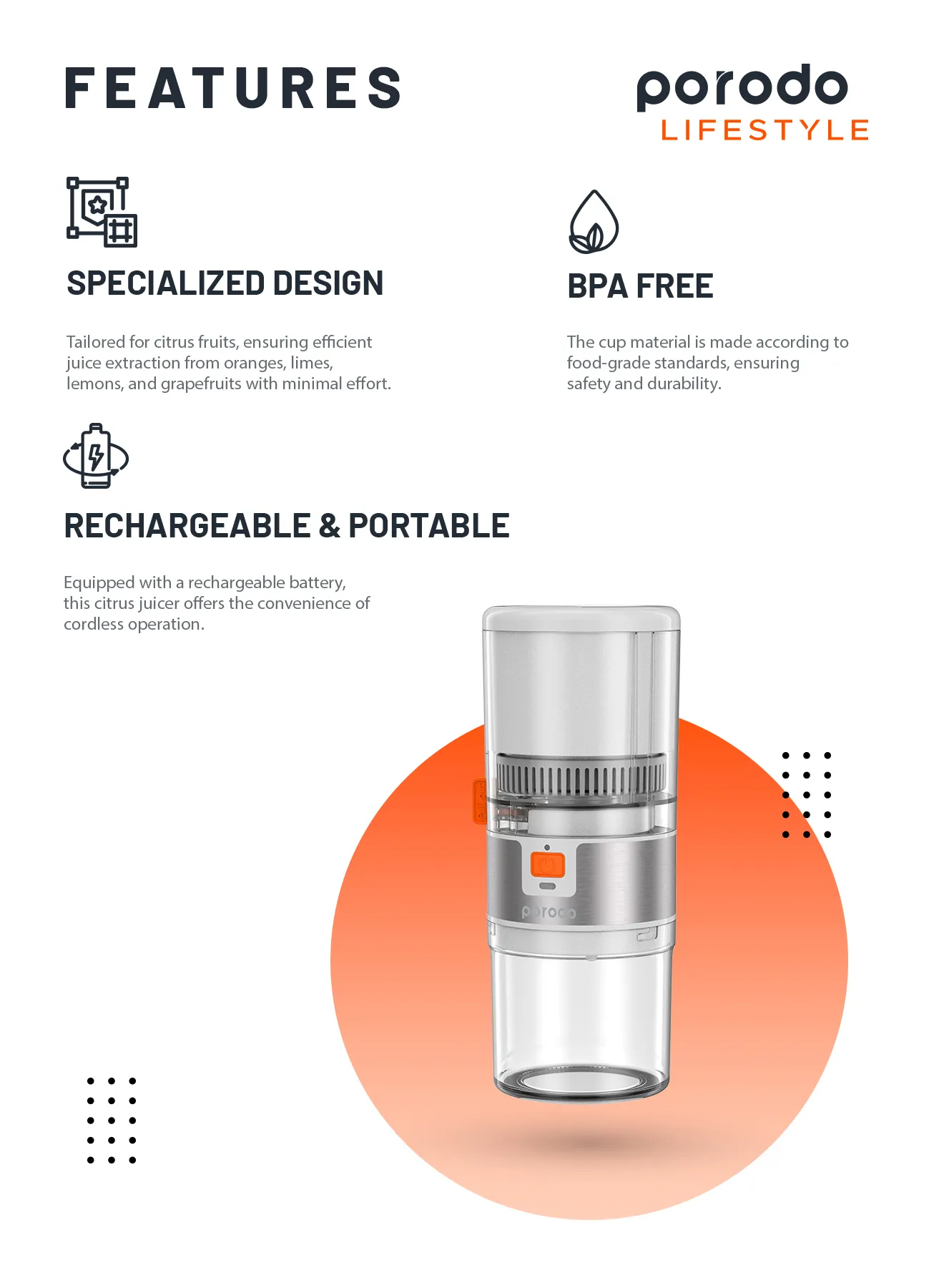 The Porodo Lifestyle Portable Cordless Citrus Juicer is a lightweight, and portable juicer that is ideal for making fresh, healthy juice.