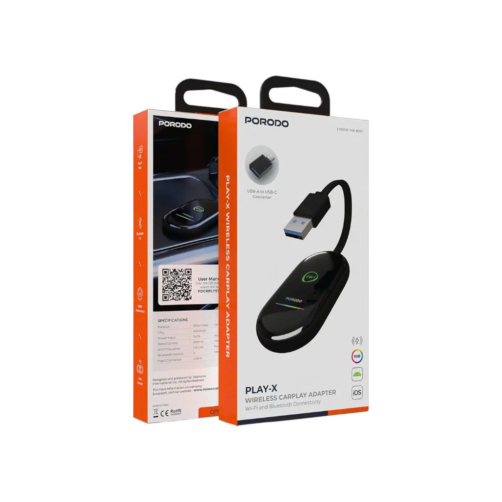 Say goodbye to tangled cables and hello to a seamless, wireless dashboard. The Porodo Play-X Wireless Adapter is a high-performance 2-in-1 dongle designed to convert your car’s factory-wired CarPlay or Android Auto into a fully wireless system. Powered by an Allwinner CPU and 5.8 GHz Wi-Fi, it delivers a lag-free experience for navigation, music, and calls the moment you start your engine.
