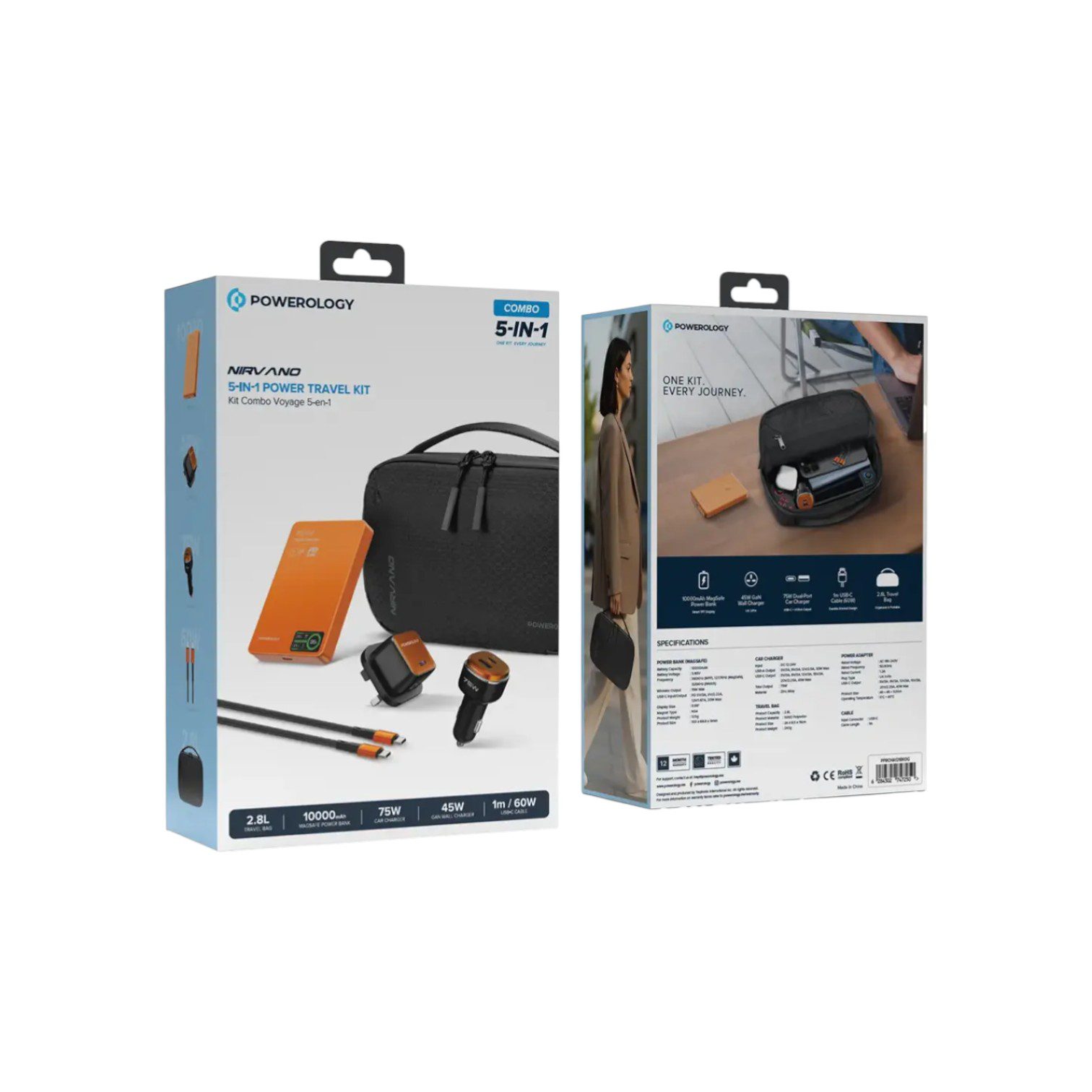The Powerology 5-in-1 Power Travel Kit is a complete charging ecosystem designed to keep your tech powered anywhere in the world. First, the heart of the kit is a 10000mAh MagSafe power bank featuring a smart TFT display for precise battery monitoring. Furthermore, the package includes a high-speed 45W GaN wall charger and a powerful 75W dual-port car charger, ensuring you can charge quickly whether you’re in a hotel or on the road. Finally, everything is neatly organized in a durable 2.8L travel bag, making it an essential “grab-and-go” solution for business trips or holidays.